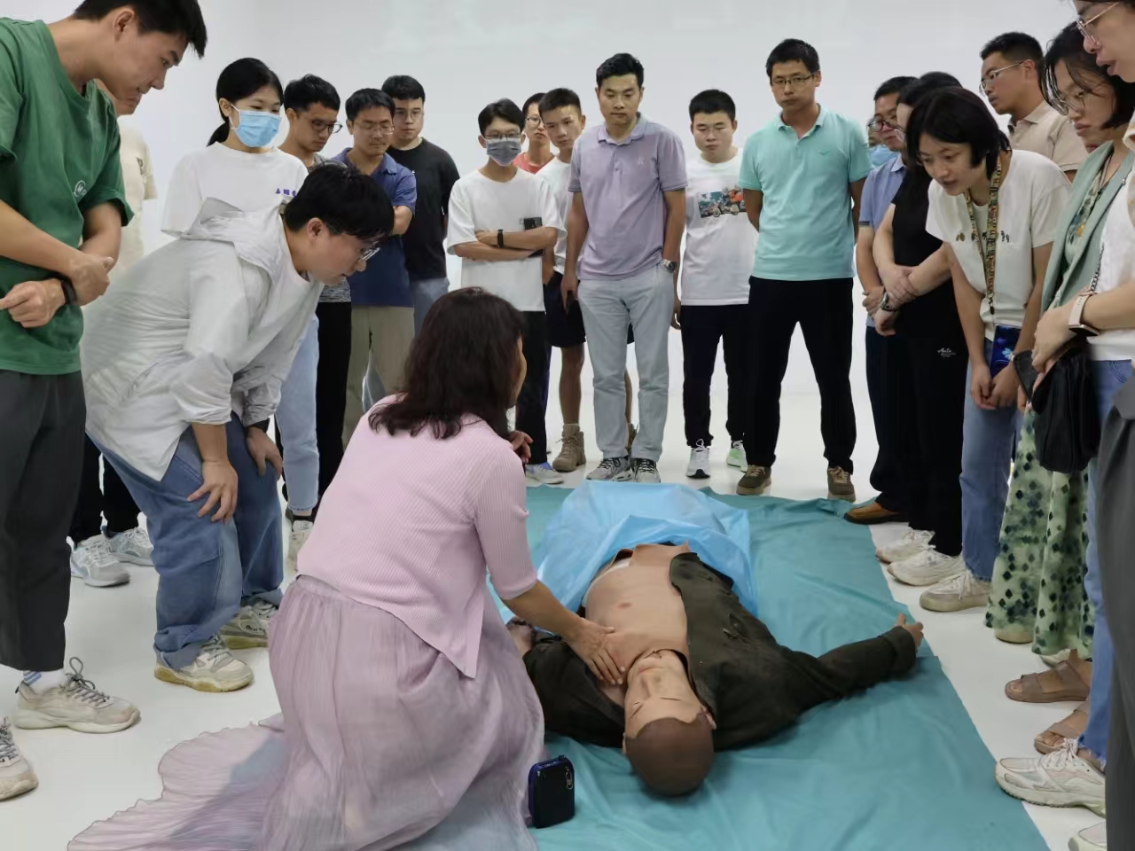 参观结束后,附属翔安医院胸外科医生姚建宇为参训人员带来了一场精彩的急救知识讲座。姚医生重点讲授了心肺复苏术(CPR)及自动体外除颤仪(AED)的操作流程与注意事项。此外,他还针对出血、烧烫伤、窒息、骨折扭伤、中暑等日常生活中的紧急情况,逐一讲解急救方法。随后,他就心肺复苏术的实施与自动体外除颤仪的使用做了示范。