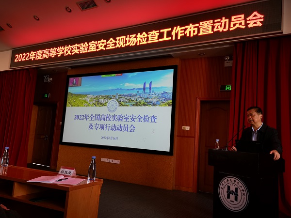为认真贯彻落实教育部相关文件精神,进一步提升学校实验室安全管理工作,3月14日下午,学校在化学报告厅召开了迎接教育部2022年度高等学校实验室安全检查工作布置动员会。会议采取线上线下相结合的方式进行,江云宝副校长首先做动员讲话,实验室与设备管理处处长施芝元对迎接教育部实验室安全现场检查进行工作部署,会议由实验室与设备管理处副处长郭志福主持。