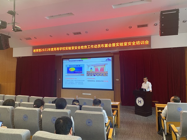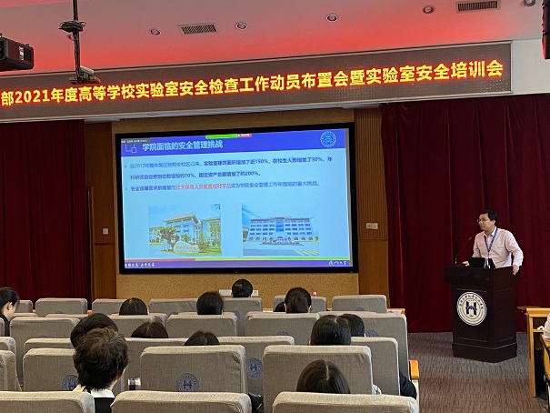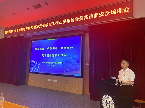 为贯彻落实《教育部办公厅关于组织开展 2021 年高等学校实验室安全检察工作的通知》(教发厅函〔 2021〕 9 号)文件精神,迎接教育部实验室安全检查,进一步提升学校实验室安全管理工作,4月28日下午,学校在化学化工报告厅召开了教育部2021年度高等学校实验室安全检查工作动员布置会暨实验室安全培训会议。实验室与设备管理处处长施芝元做动员及培训报告、生命科学学院书记左正宏、化学化工学院实验室安全秘书黄木河代表学院、基层实验室做实验室安全经验介绍。