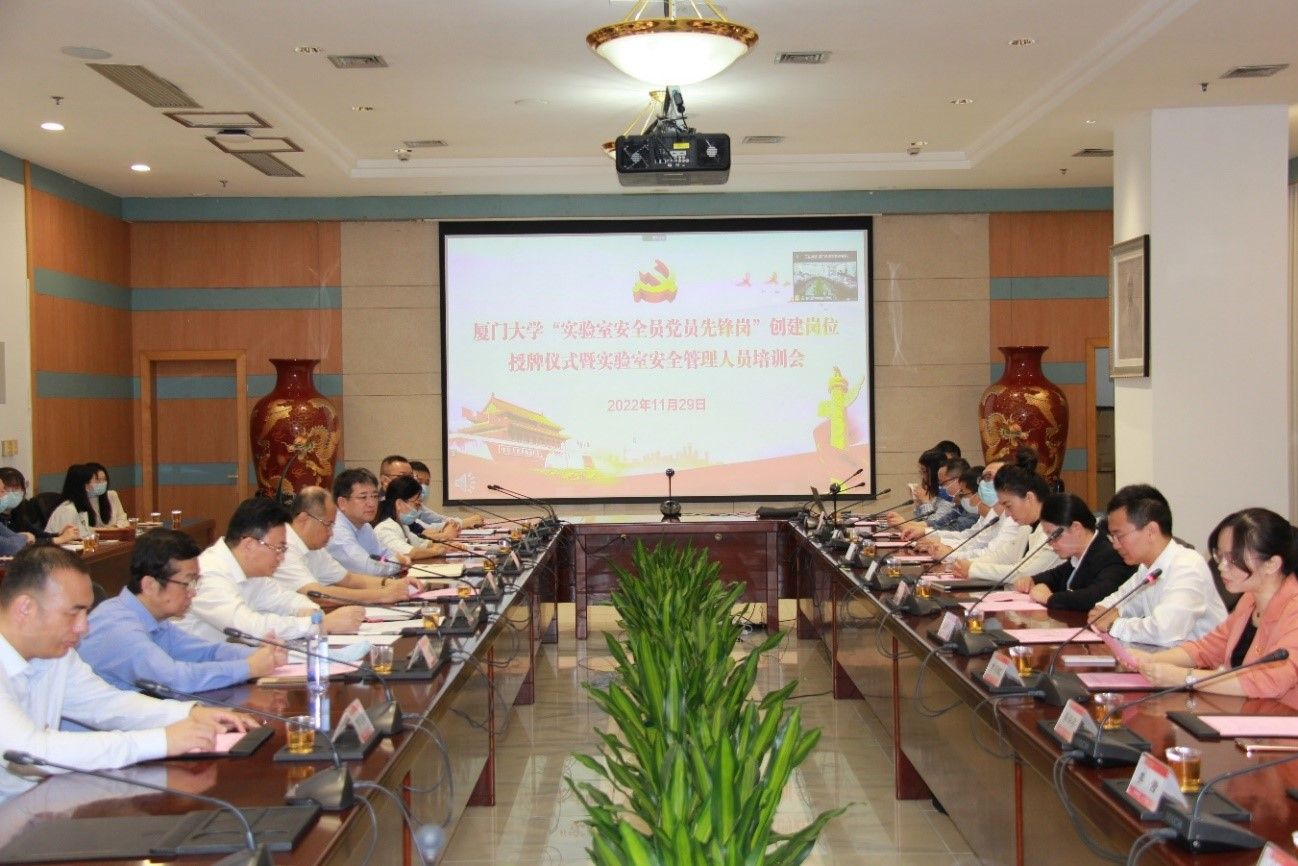 为深入学习贯彻党的二十大精神,全面贯彻落实习近平总书记关于安全生产的重要论述和指示批示精神,统筹推进党建工作与实验室安全业务深度融合,11月29日上午,厦门大学“实验室安全员党员先锋岗”创建岗位授牌仪式暨实验室安全管理人员培训会在颂恩楼215会议室举行。教育部直属高校党建工作联络员、浙江大学原党委常务副书记陈子辰线上出席会议;校党委常务副书记林东伟,校党委常委、副校长江云宝,国家应急救援员、福建省应急管理讲师、厦门市应急管理专家林乐坦,“实验室安全员党员先锋岗”创建岗位责任人以及各相关职能部门负责人线下参会。会议由校党委常委,组织部部长、统战部部长孙理主持。