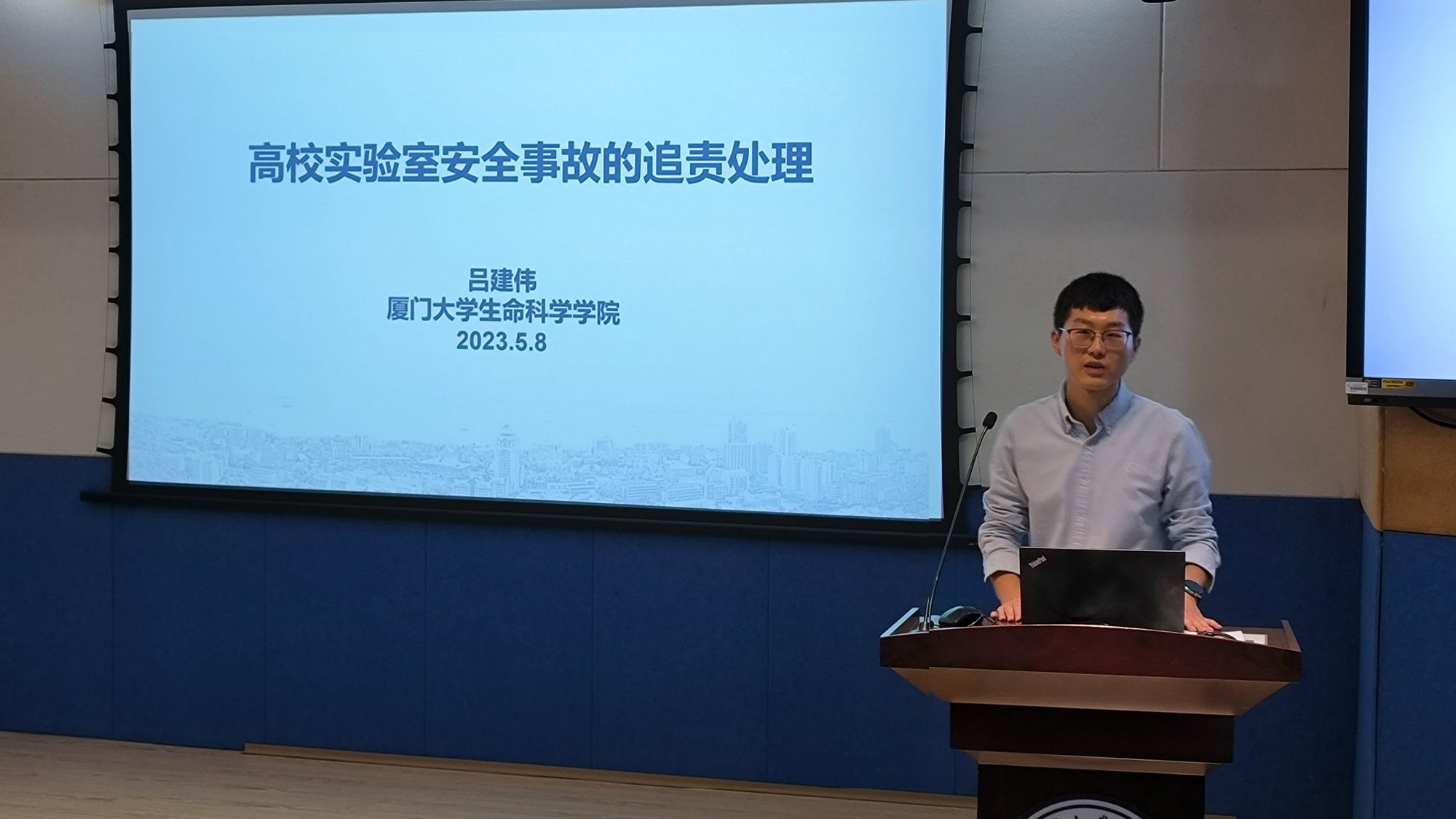 为切实增强学校实验室安全管理能力和水平,强化责任意识,保障校园安全稳定和师生生命安全,学习贯彻落实《教育部直属高校实验室安全事故事件追责问责办法(试行)》,5月8日下午,学校在卢嘉锡楼202报告厅举办高校实验室安全事故事件追责问责工作专题培训会,会议邀请到生命科学学院吕建伟助理教授进行题为《高校实验室安全事故的追责处理》的主题报告。各学院(研究院)实验室秘书、实验室安全员党员先锋岗创建岗位责任人等50余人参加会议,会议由实验室与设备管理处张昌胜副处长主持。